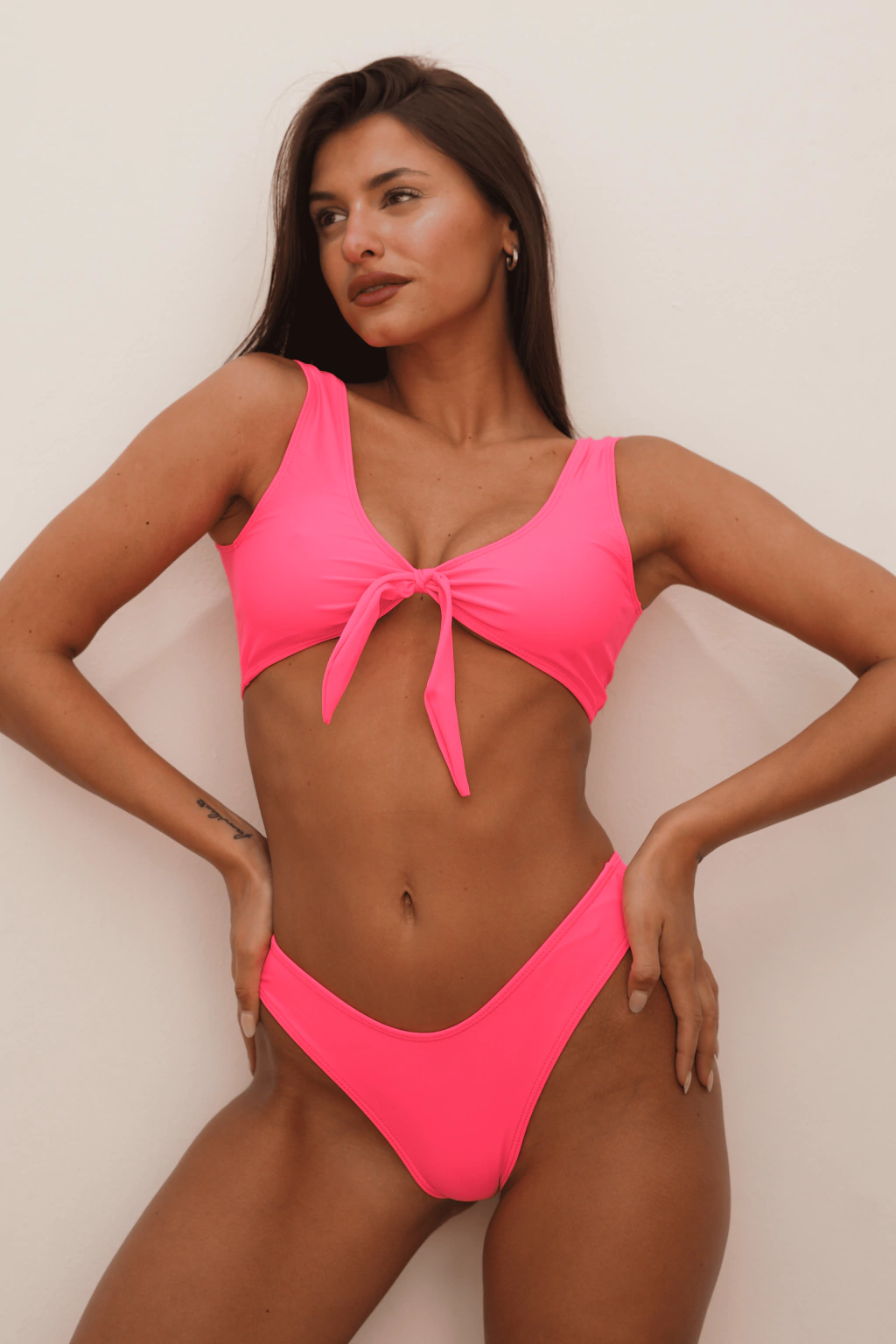 Confeccionado en tela Tricot, es un conjunto de dos piezas, con un corpiño tipo top de tiras anchas, que cuenta con una tira en el medio que se puede sacar y de esta manera brinda que la parte de arriba del bikini pueda contar con dos maneras de uso, asi mismo cuenta con tasas desmontables, la bombacha es tipo colales con tiras gruesas.