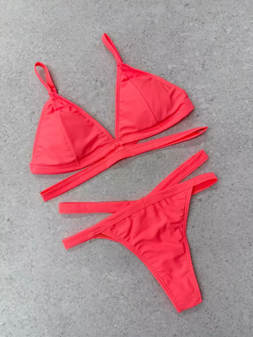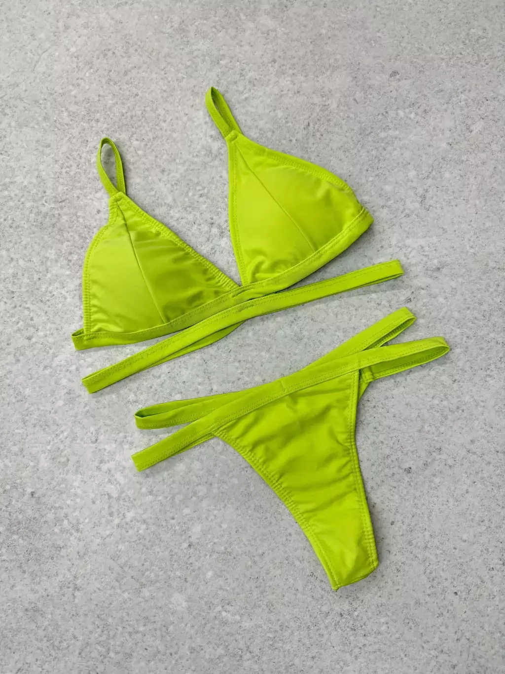 Confeccionado en tela Tricot, este conjunto incluye dos piezas que realzarán tu figura. Con un corpiño en forma de triangulo con doble tira con tazas desmontables y la bombacha tipo colaless doble tira. Perfecto para ocasiones especiales. Atrévete a lucir elegante y femenina.